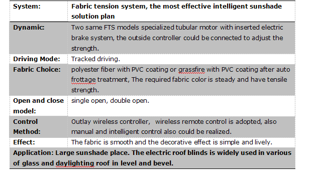 FTS天棚簾特別適用于普通電動卷簾無法安裝的彎曲、傾斜的場合,整個系統(tǒng)由驅(qū)動系統(tǒng)、面料和控制系統(tǒng)三部分組成,驅(qū)動系統(tǒng)采用2個FTS專用管狀電機,分別安裝在兩條卷管中,面料一端固定在其中一條卷管上,固定面料另一端的鋼絲繩卷曲在另一條卷管的卷繩器上。這兩臺電機通過一個專用的控制器協(xié)調(diào)工作,其中一臺電機提供面料運行的動力,另一臺電機的剎車同時工作,提供一定的阻力拖住面料,避免面料下墜,天棚完全打開后,面料會卷在其中一條卷管上,運行中或停止時面料均有張力,可制作大面積的平面或弧形面的天棚簾系統(tǒng)。